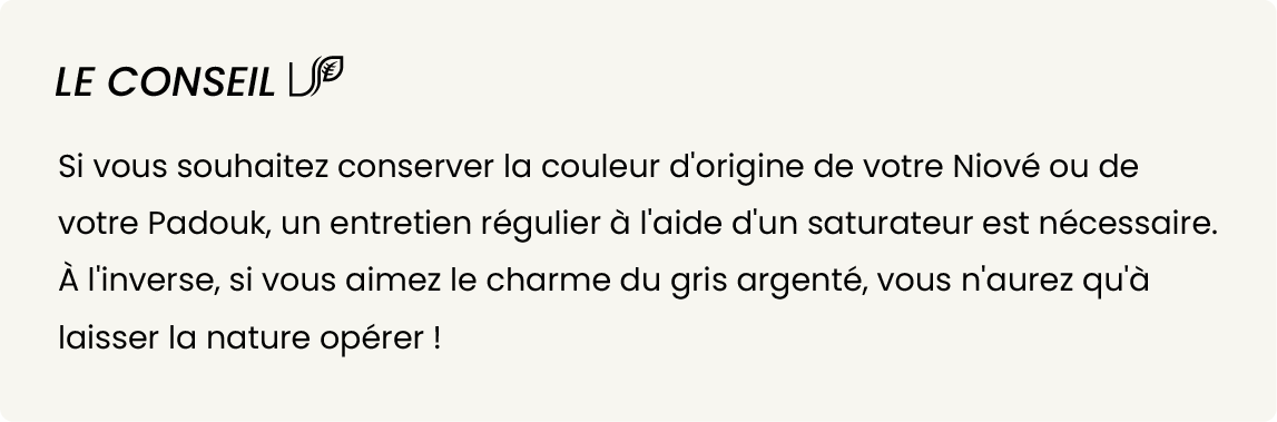 Il est important de noter qu’en extérieur, tout bois finit par griser avec le temps sous l’effet des rayons UV et des intempéries. C’est un phénomène naturel qui n’altère en rien la solidité du bois.